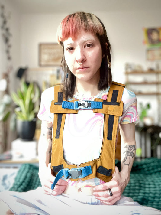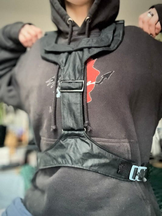 With a cool and comfortable aesthetic, the harness acts as compression to help feel calm, and provides a feeling of safety and security. Made from cotton moleskin and wax cotton fabric with metal adjusters, magnetic buckles and N40 magnets that connect to the Sensory Hood.